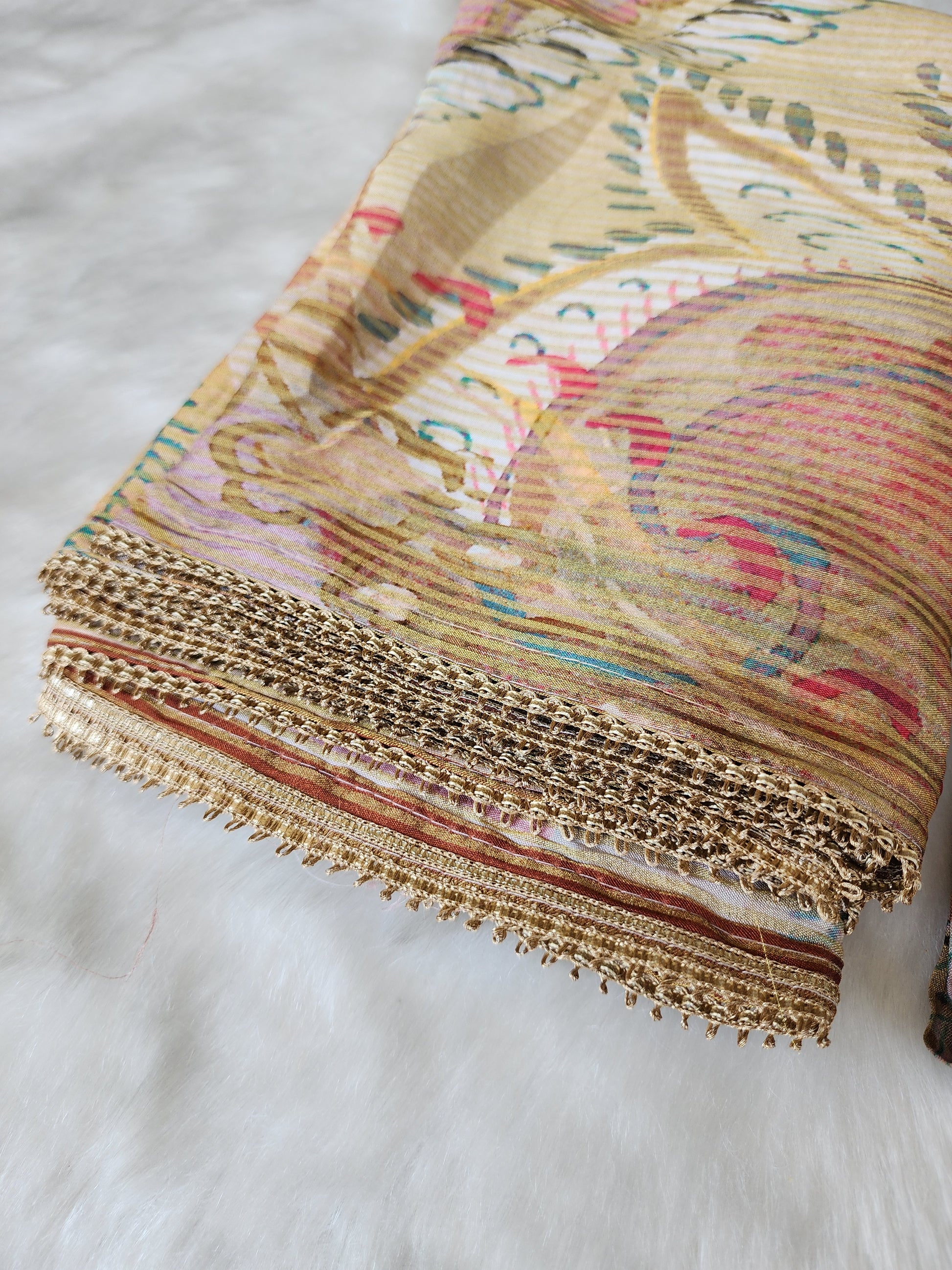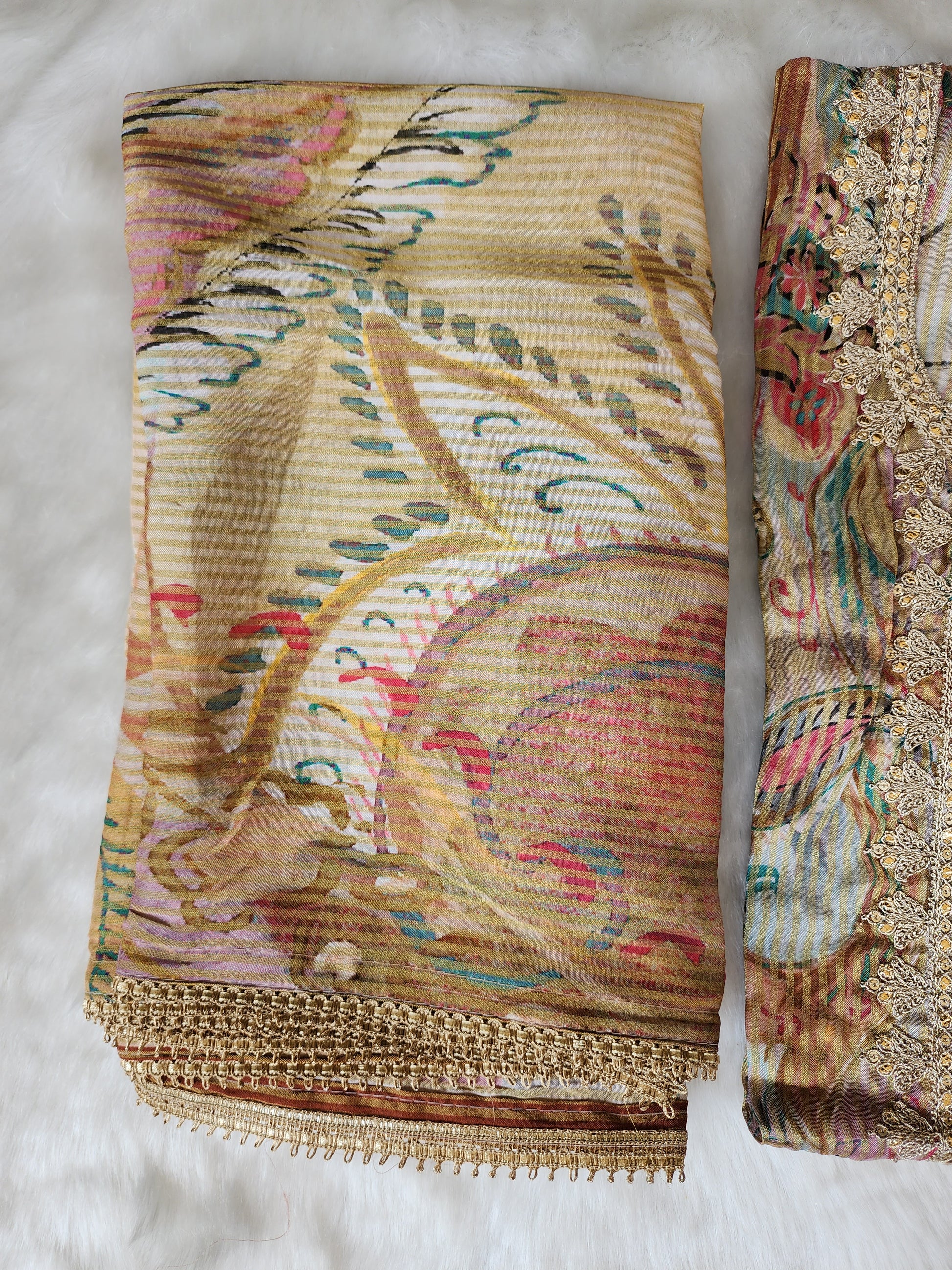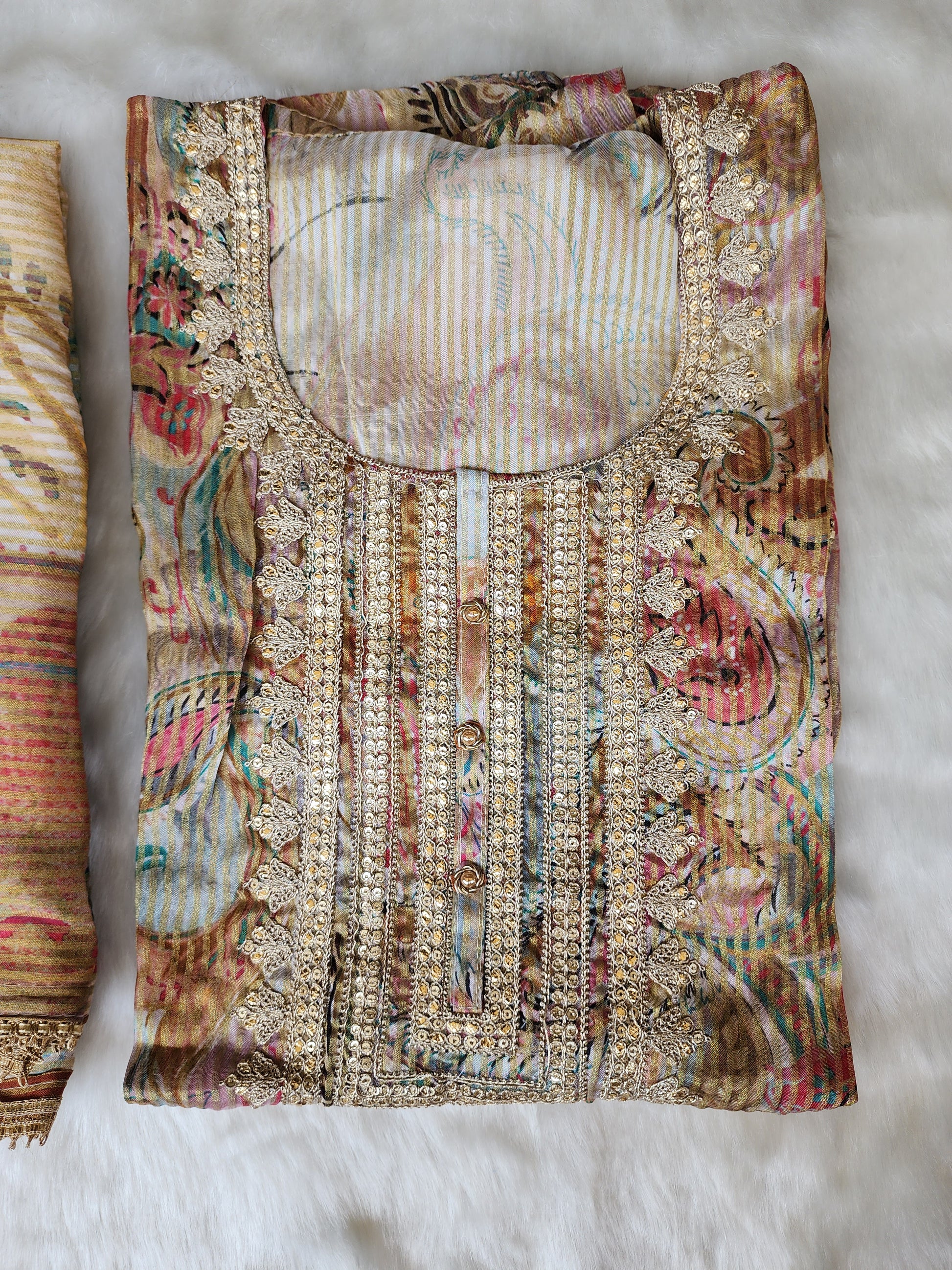 Expertly crafted with luxurious organza and delicate tissue, this Beige Printed Organza Tissue Suit showcases stunning hand embroidery. Elevate any occasion with this elegant and sophisticated suit that exudes class and style. Experience the perfect combination of comfort and luxury with this must-have addition to your wardrobe.
