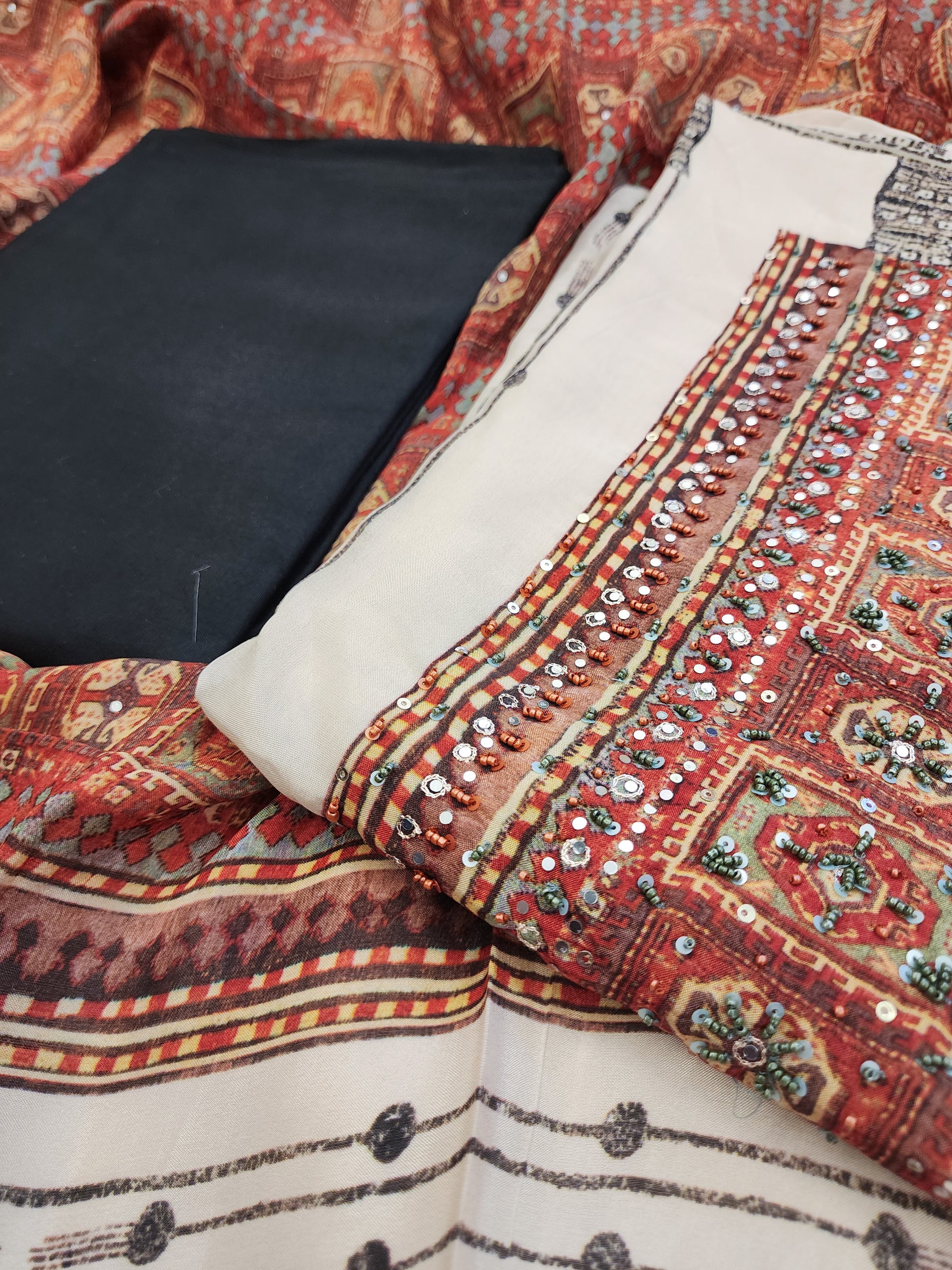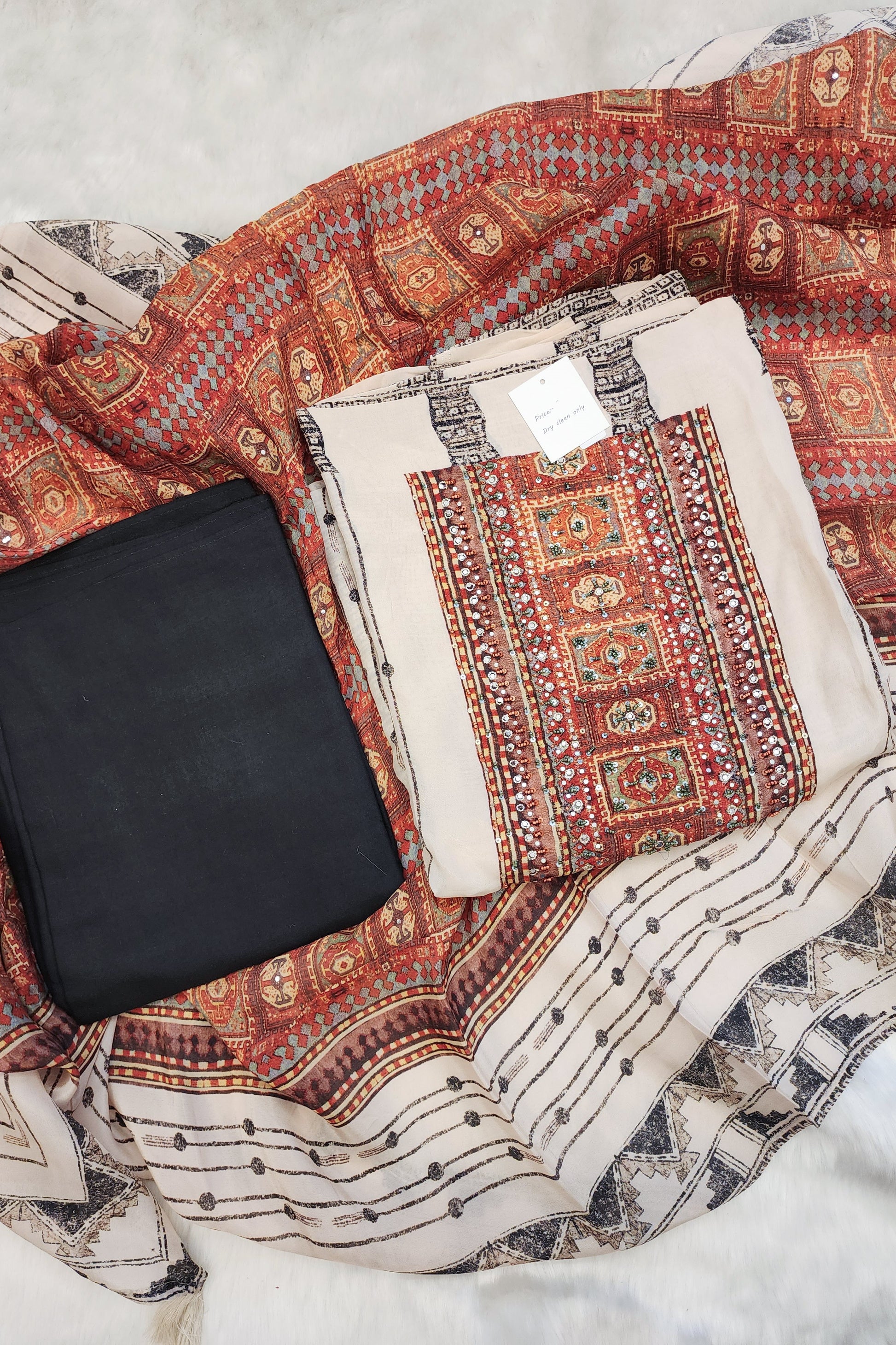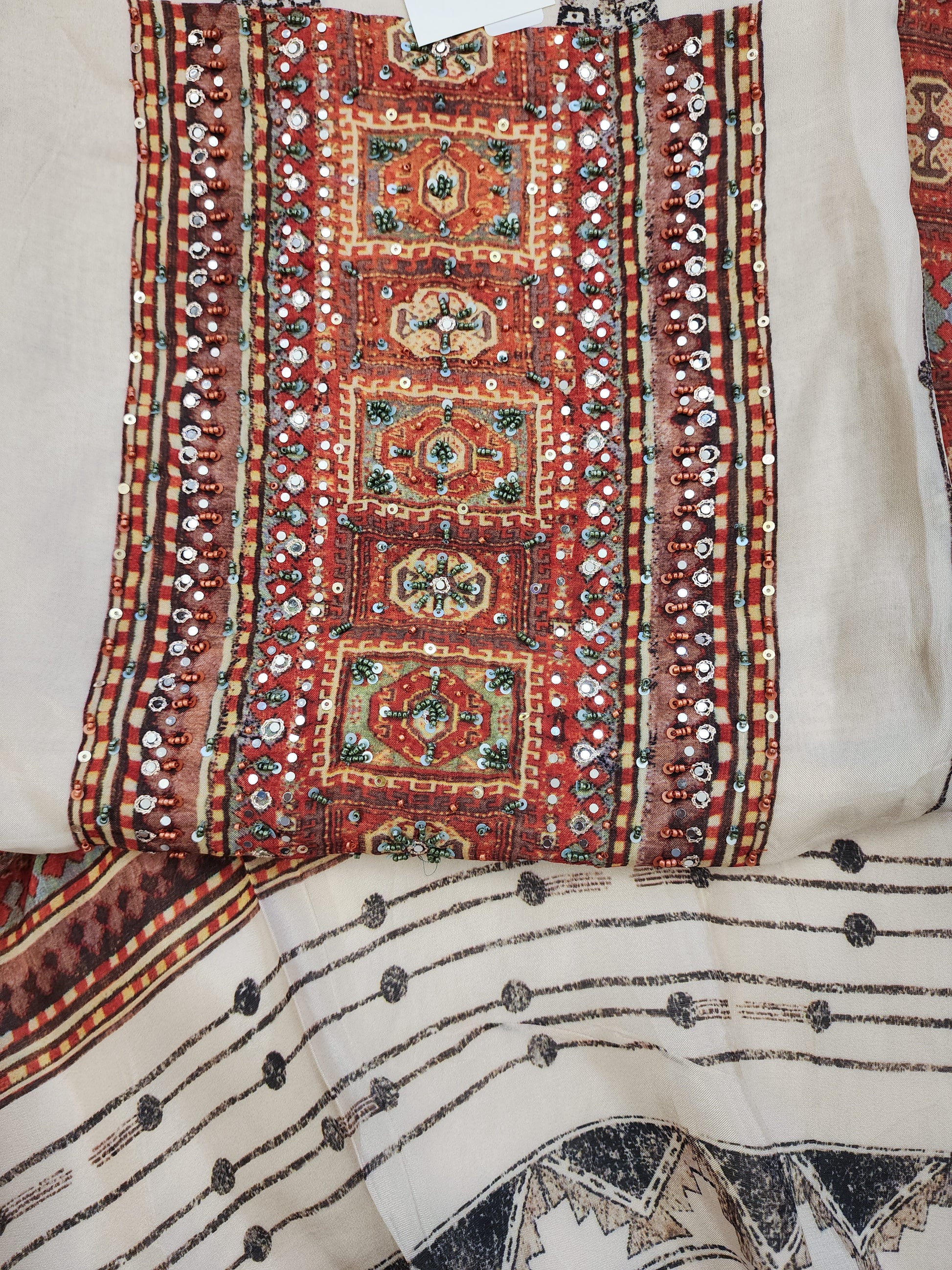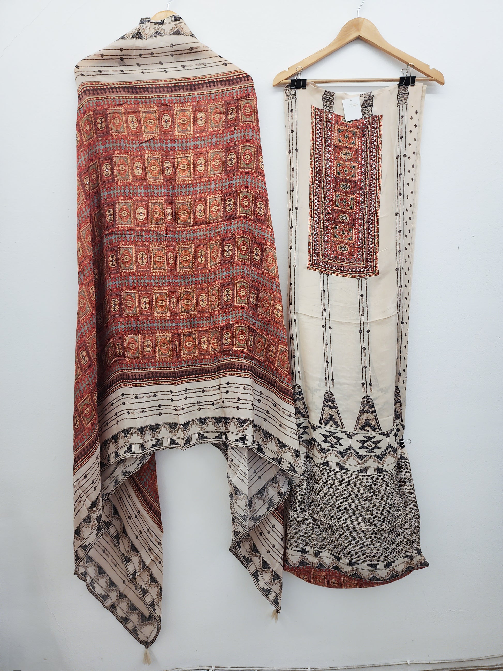 This Beige Pure Crepe Printed Suit is the perfect addition to any wardrobe. Made with high-quality crepe fabric, it features delicate embroidery and comes in unstitched dress material. Elevate your style with this elegant and versatile piece.