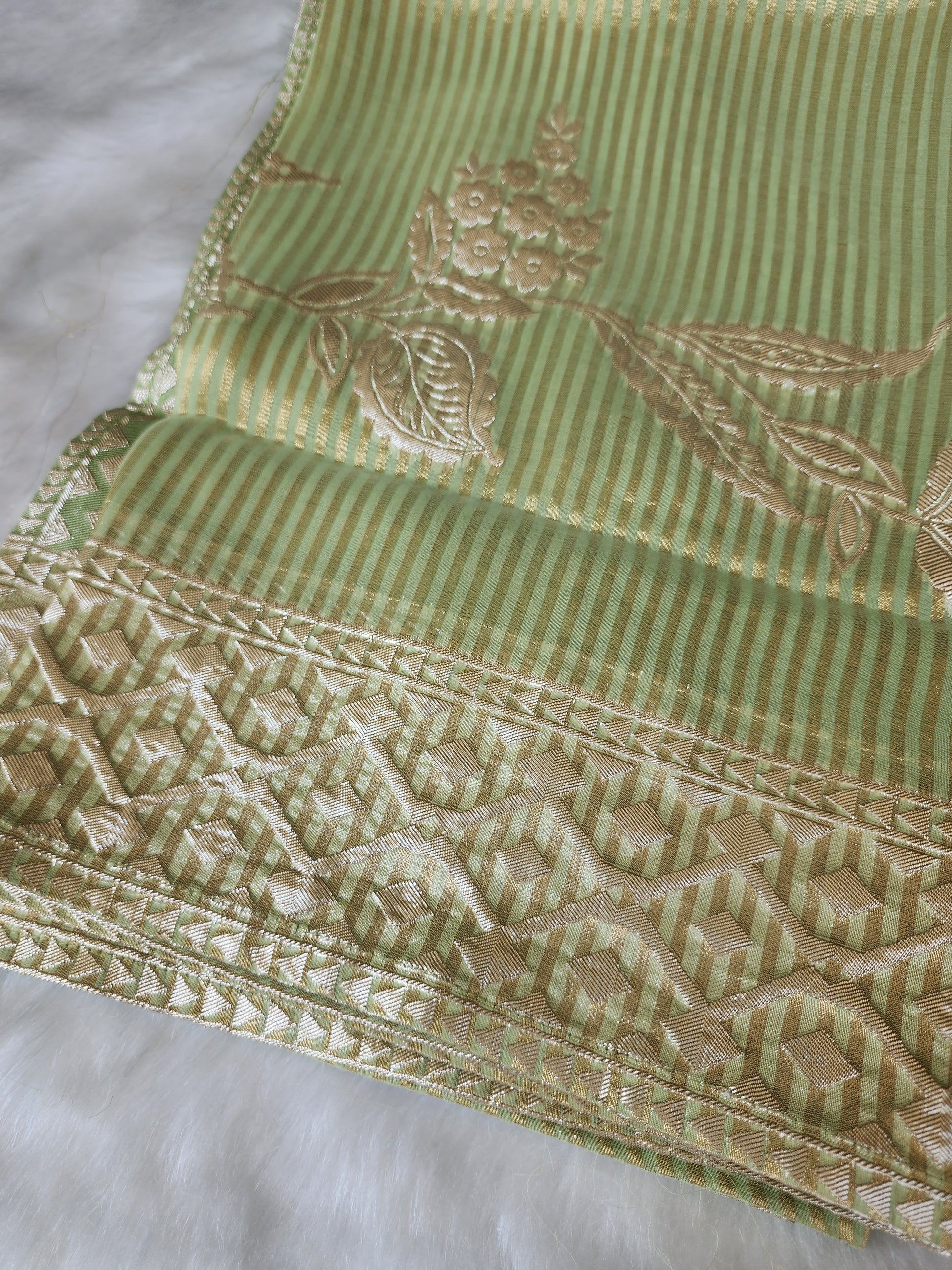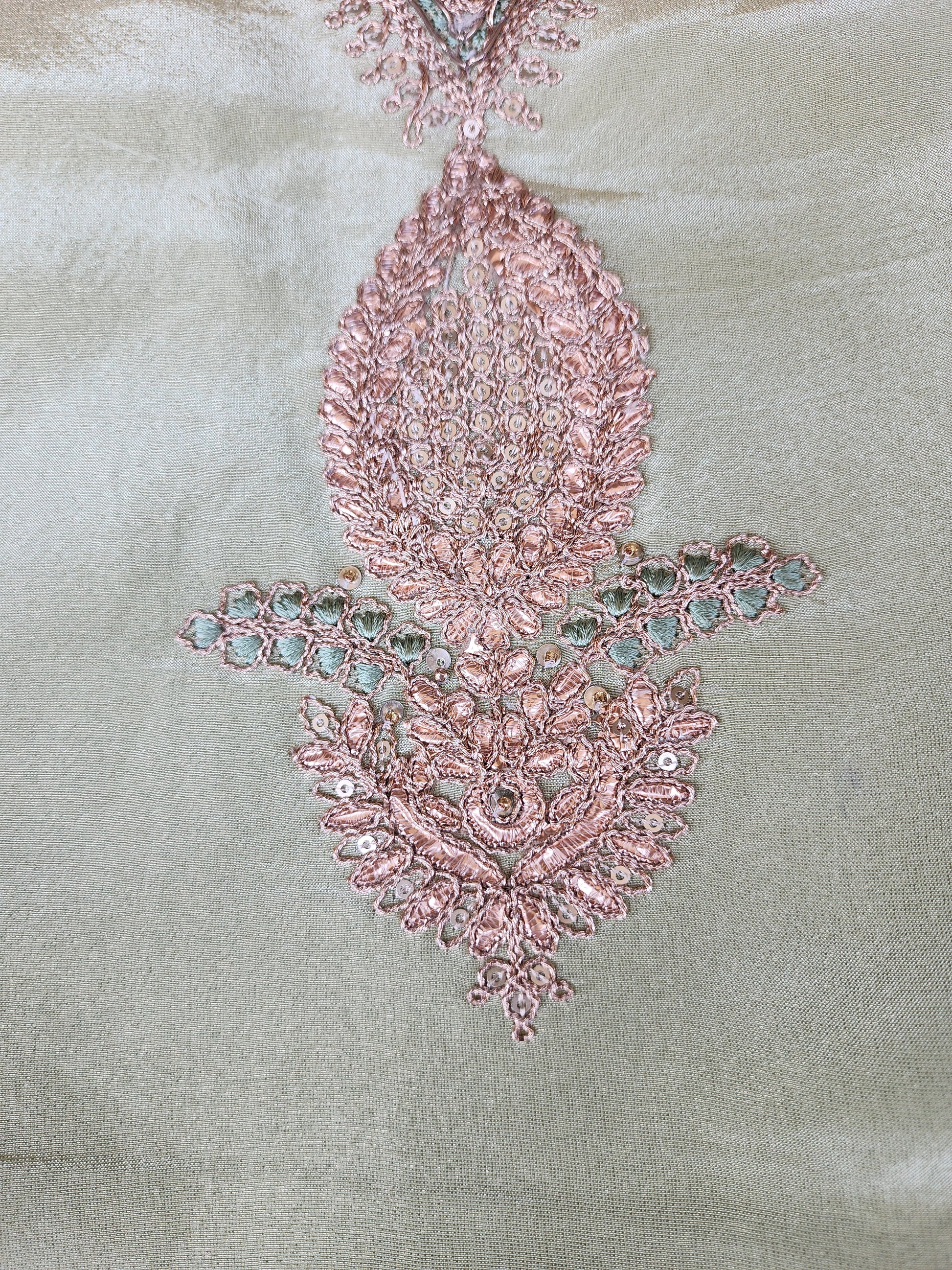 This Green Shimmer Tissue Suit boasts handiwork and a shimmer tissue zari dupatta. Experience the luxurious feel of handiwork and the sparkling shimmer of zari, making a statement with this suit's elegant green color. Effortlessly elevate your style with this stunning suit.