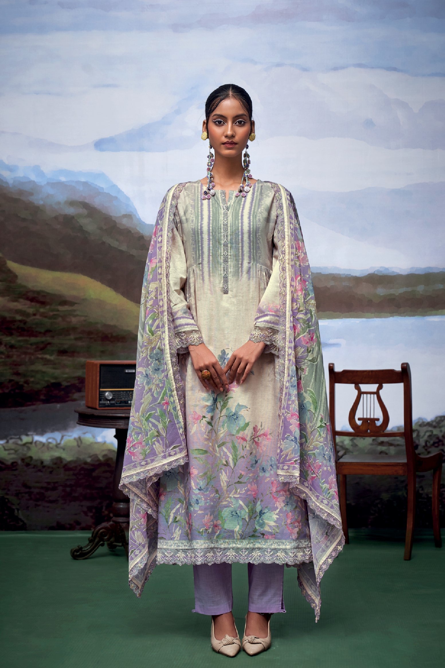 Dupatta: Pure linen with digital print and four sided scalloped embroidery organza border.