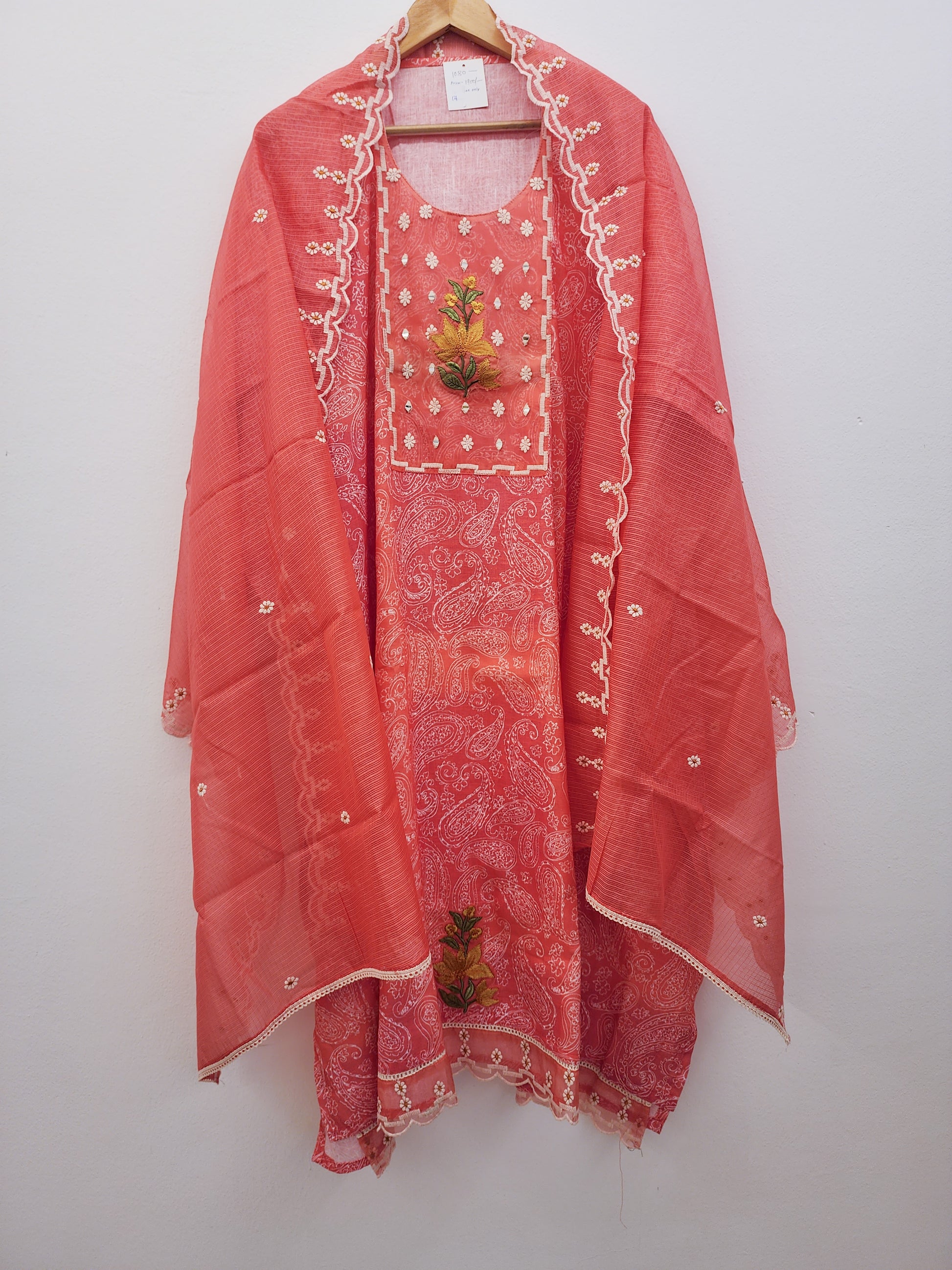 Introducing our Peach Linen Cotton, a beautiful addition to your wardrobe! Crafted with pink linen cotton and intricate thread work, this piece is both elegant and comfortable. Enjoy the benefits of high-quality fabric and delicate details in this must-have garment.