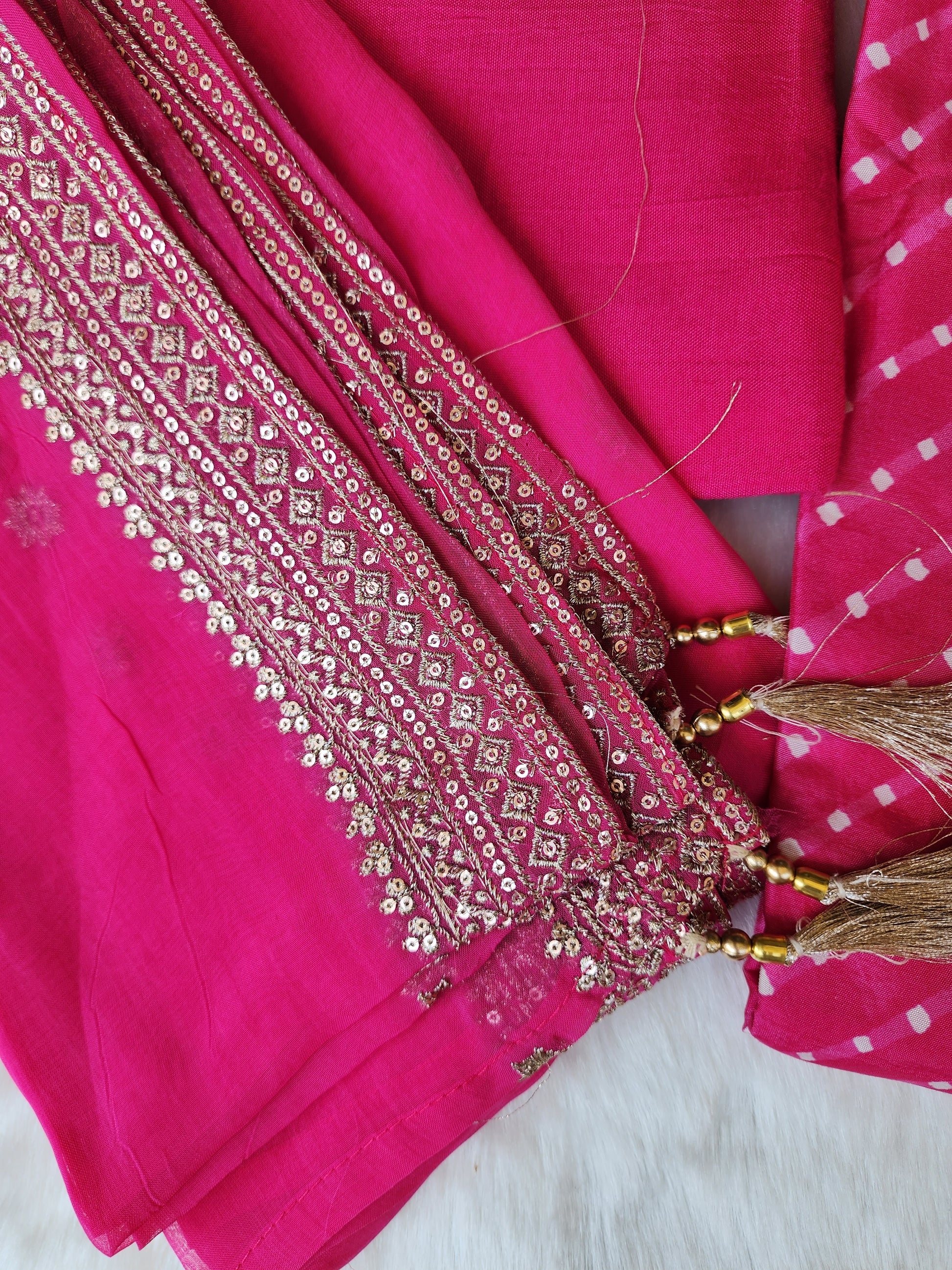 Crafted with luxurious pink silk and adorned with intricate zari hand work, this Pink Silk Suit is the epitome of sophistication and elegance. Complete the look with the included organza dupatta for a touch of grace. Dress to impress with this must-have addition to your wardrobe.