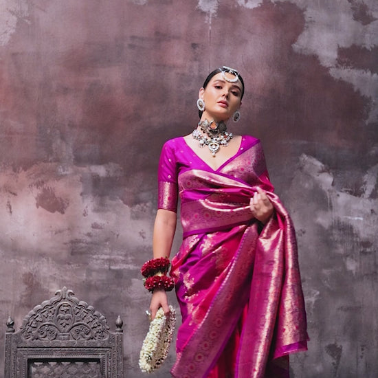 Introducing the Sharini Silk Saree - a luxurious and elegant choice for any occasion. Made with Rangkaat handloom weave silk, this saree showcases the finest quality and craftsmanship. Upgrade your wardrobe with this timeless piece that exudes sophistication and beauty.
