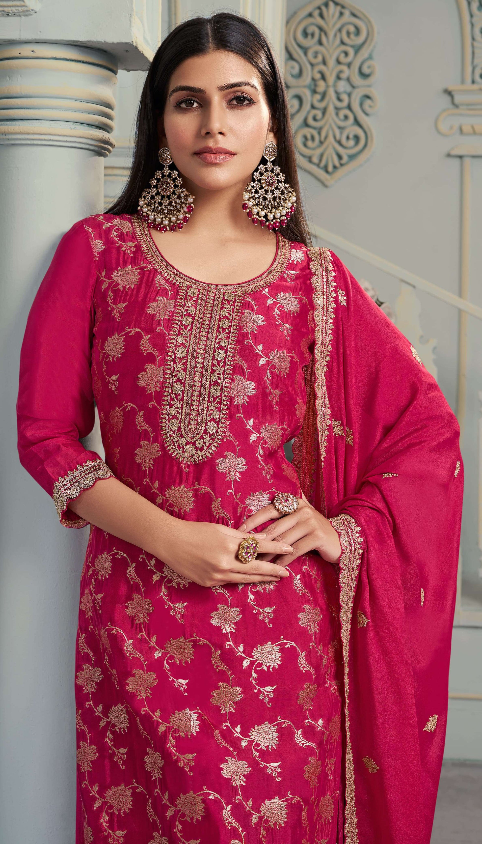 Crafted from luxurious lotus silk jaquard, this Shristi dress material features intricate embroidered detailing, adding an elegant touch to any outfit. Experience the effortless beauty and comfort of this high-quality fabric, perfect for any special occasion. Elevate your wardrobe with this expertly designed piece.