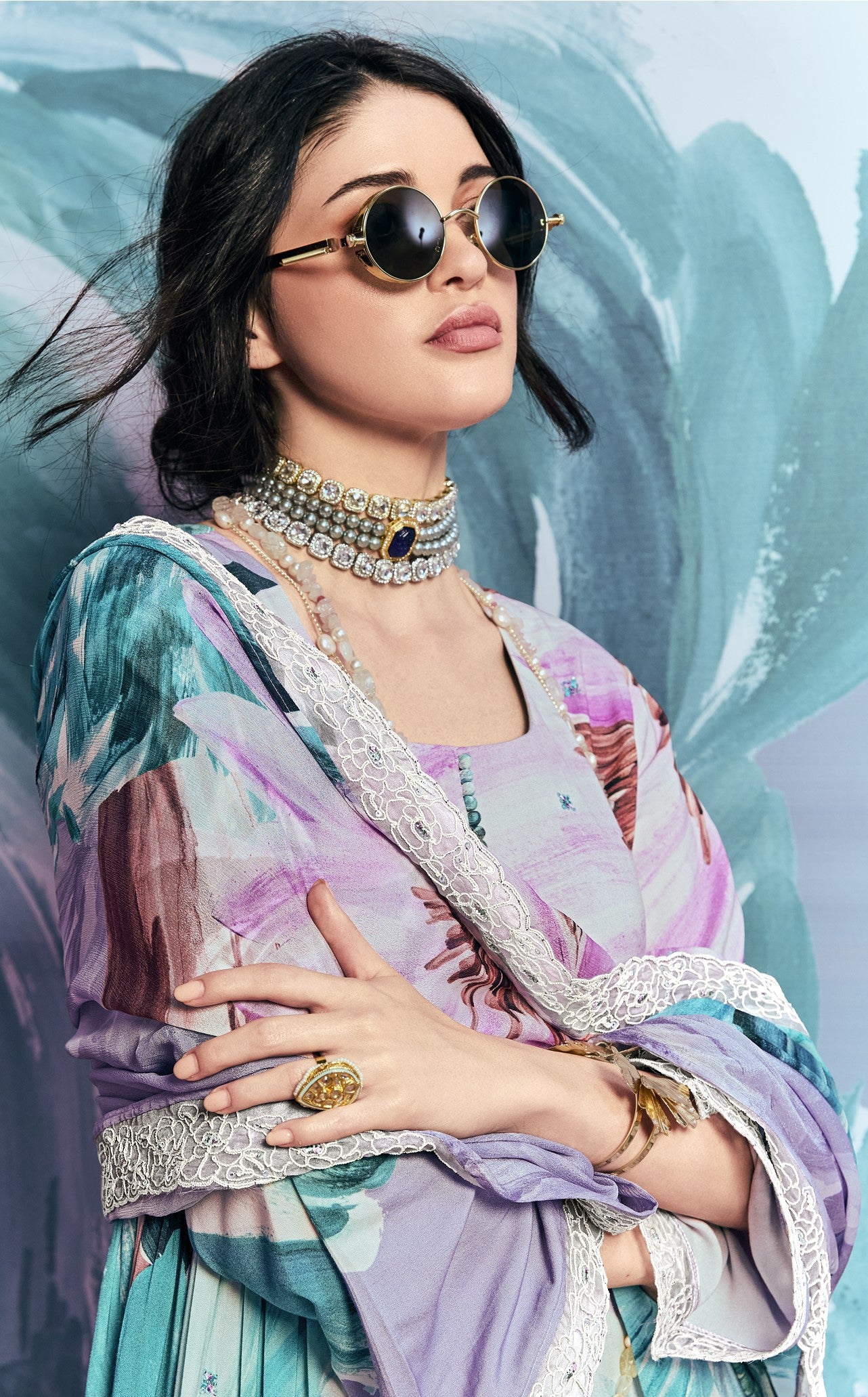 Dupatta: - Pure Chinon with digital print and pearl dori embroidery cutwork border.